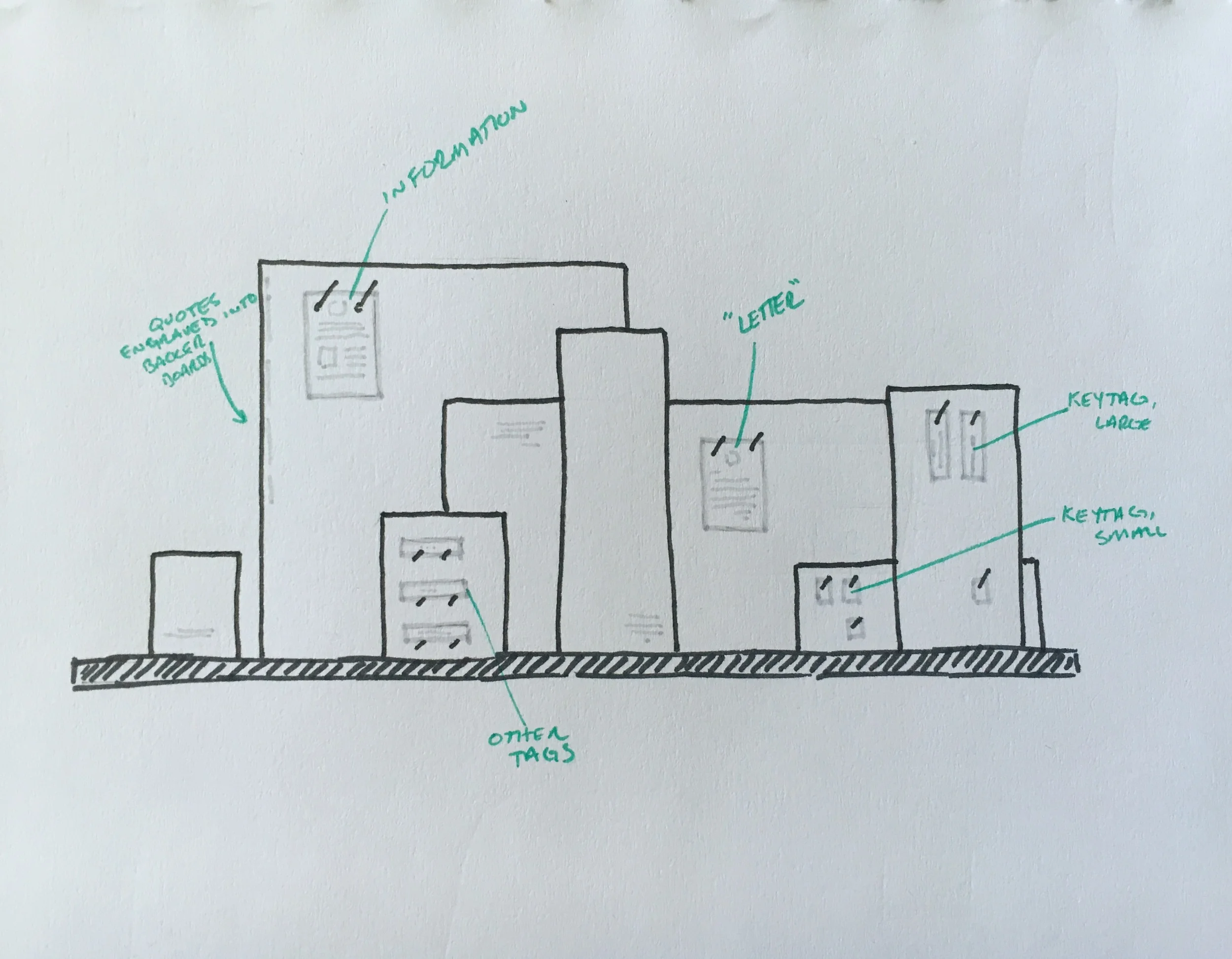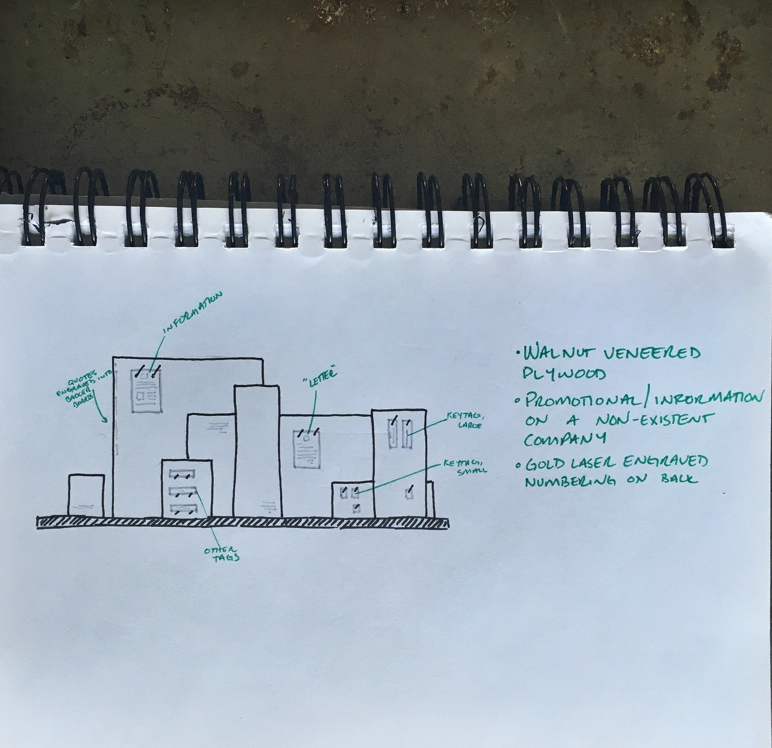 Thinner boards of similarly treated wood are laser etched with text and emblems to make them seem similar to other classically bulk produced marketing material (ie. key chains, flyers, letters, magnets, stickers, etc.). They will feature information for a brand/company/person/thing/etc.. Maybe Emily Dickinson poems?